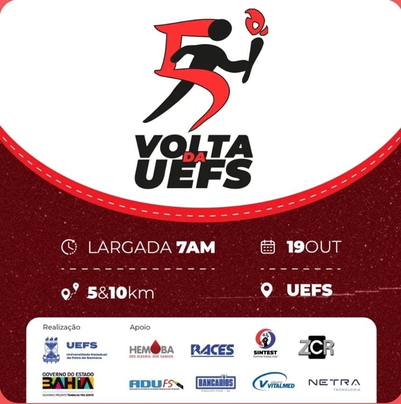 O evento, realizado pela UEFS e Governo do Estado, conta com o apoio de instituições como HEMOBA, ADUFS, Sindipetro, RACES, Sindicato dos Bancários, SINTEST, VITALMED, NETRA Tecnologia, ZCR e as parcerias de VosSaúde, AmaRillys Moda Fitnees, Dragornia Cervejaria, BODY Suplementos, Eurico Gaspar – Centro de Reabilitação, Fulora Kombucha, Açaizinho Original e Lisô Laser.